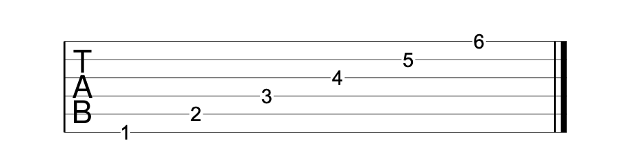 We number the frets starting from the one closest to the nut—fret one. Technically, any sequence could work, but we all had a meeting and agreed one was a solid place to begin. So, fret one is right next to the nut, fret two comes after that, and so on. In tablature, numbers are placed on each line to show which fret to play on which string. This system works like a coordinate grid: strings run North-South, and frets run East-West. Using this, you can pinpoint exactly where to place your fingers, just like finding a location on a map. Have a look at the example below and find each note on your guitar.