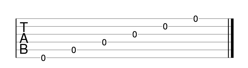 But what about open strings? You might have already guessed, but zero is used to indicate an open string. For example, the example below shows how all the open guitar strings appear in tablature.
