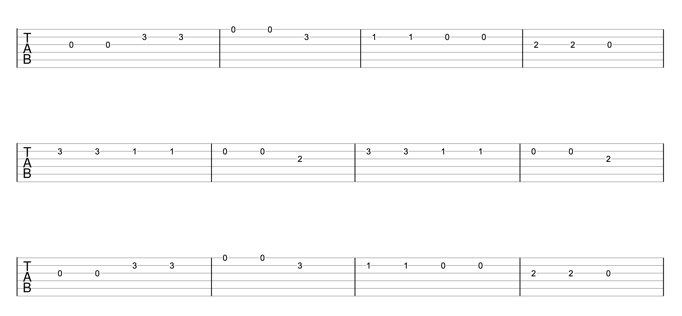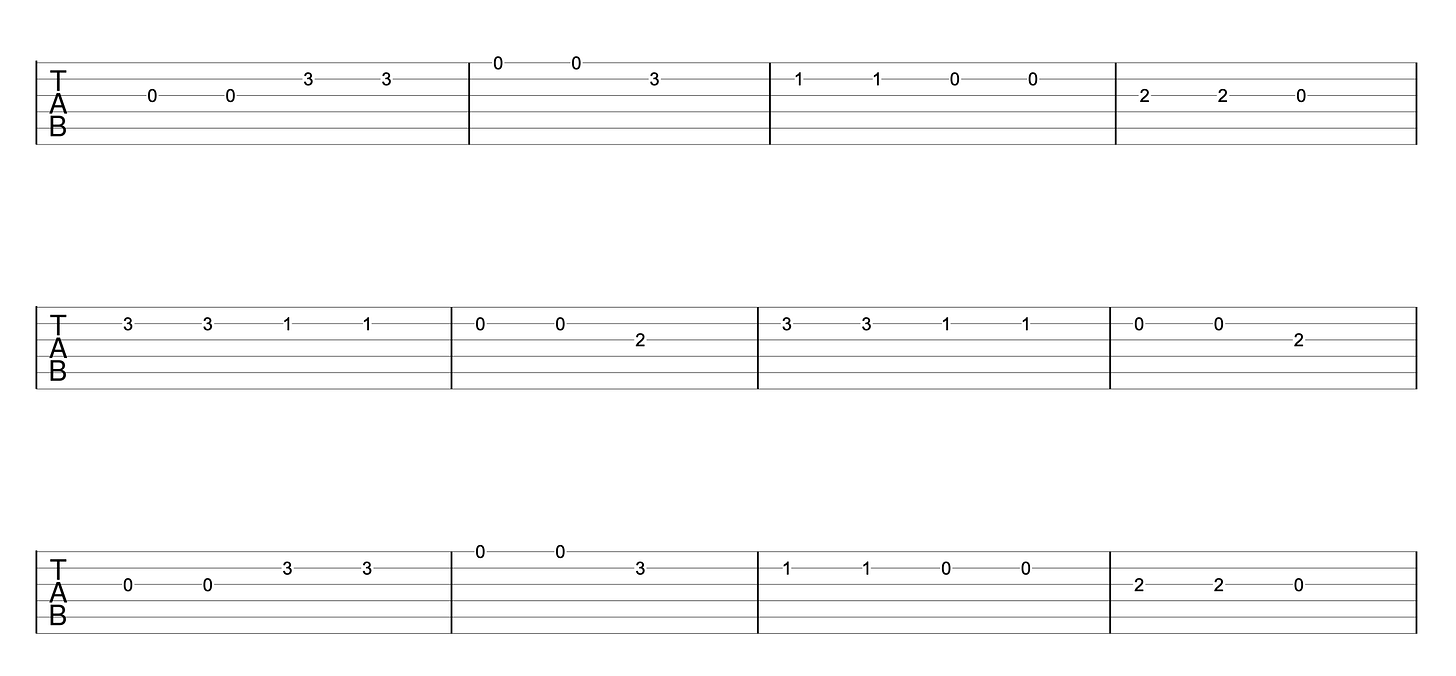 Guitar tabs don’t just show single notes—they can also represent intervals1 and full chords. In earlier examples, the numbers were written one after another, meaning the notes should be played in sequence. But when numbers are stacked vertically, it means those notes are played at the same time.